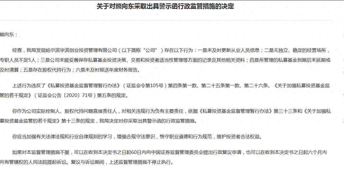 熊向东作为公司实际控制人、股权代持问题直接责任人,对相关违规行为负有主要责任,依据《私募投资基金监督管理暂行办法》第三十三条和《关于加强私募投资基金监管的若干规定》第十三条的规定,黑龙江证监局决定对其采取出具警示函的行政监管措施。