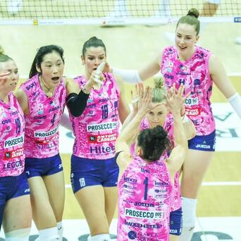 意大利女排联赛决赛首回合,朱婷效力的科内利亚诺队3比2险胜米兰队,25-20、25-27、20-25、27-25、15-13。